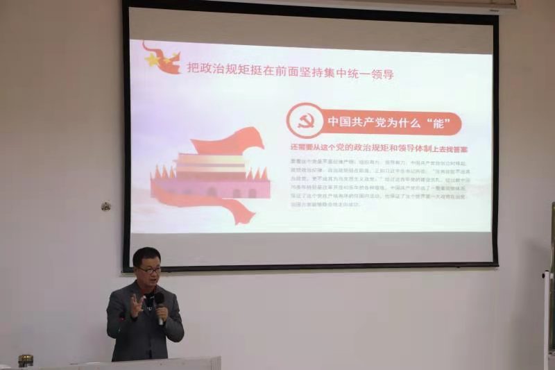 洪荣文围绕“中国共产党为什么能够长期执政”主题,结合党史经典案例深刻阐述中国共产党为什么‘能’、马克思主义为什么‘行’、中国特色社会主义为什么‘好’的道理和经验,引导教育师生要从党的非凡历程中感悟马克思主义的真理力量和实践力量,坚持不懈用党的创新理论最新成果武装头脑、指导实践、推动工作,以党史学习教育为契机,传承发扬好党的光荣传统和优良作风,不断提高政治判断力、政治领悟力、政治执行力,在学党史中汲取奋进力量。