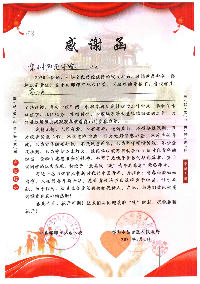 近日,我院收到一封来自邯郸市丛台区的感谢函,2018级通信工程专业孟洁同学受到邯郸市丛台区委、区政府的表扬和肯定,被授予“最美战‘疫’青年志愿者”荣誉称号。感谢函中指出,2021年初河北新冠肺炎疫情发生后,孟洁同学主动请缨,积极参与志愿活动,承担了社区服务、疫情科普等大量艰难细致的工作,为疫情防控工作贡献了一份力量。