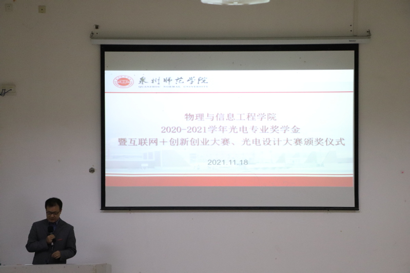 11月18日下午,我院在理工218教室举行2021年光电信息科学与工程专业奖学金暨学科竞赛获奖团队奖励金颁发仪式。院长、党委书记杨惠山,院党委副书记、纪委书记洪荣文,院党委副书记吴丽双,副院长陈木生、陈慧彬,科室负责人、辅导员、光电专业全体师生和学科竞赛获奖团队代表参加,本次活动由洪荣文主持。