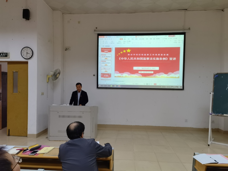 为进一步学习贯彻《中华人民共和国监察法实施条例》,加强普法宣传,引导学院教职工提升依法履职能力,提升学院纪检监察工作规范化、法治化、正规化水平,2021年12月23日下午,我院党委副书记、纪委书记洪荣文在理工218教室为全院教职工开展宣讲活动。