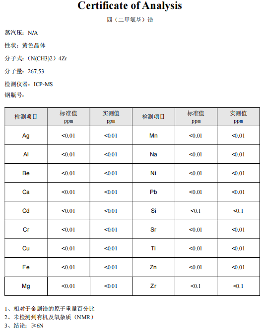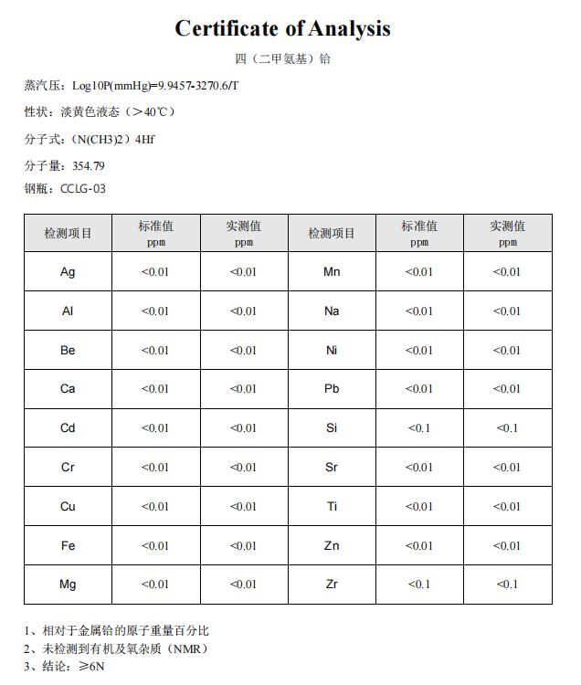 1 | 四二甲氨基铪,带钢瓶(容量≥316L),参数详见下表 | 50克 |