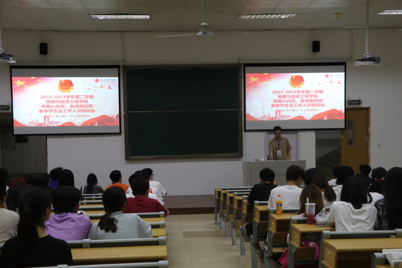 为深入学习宣传贯彻党的二十大精神,健全和完善学生会管理,2023年5月28日晚上,我院在理工218教室举办2022-2023学年第二学期学生会工作人员培训班,培训班由院学生会主席团成员主持,学生会全体工作人员参加。