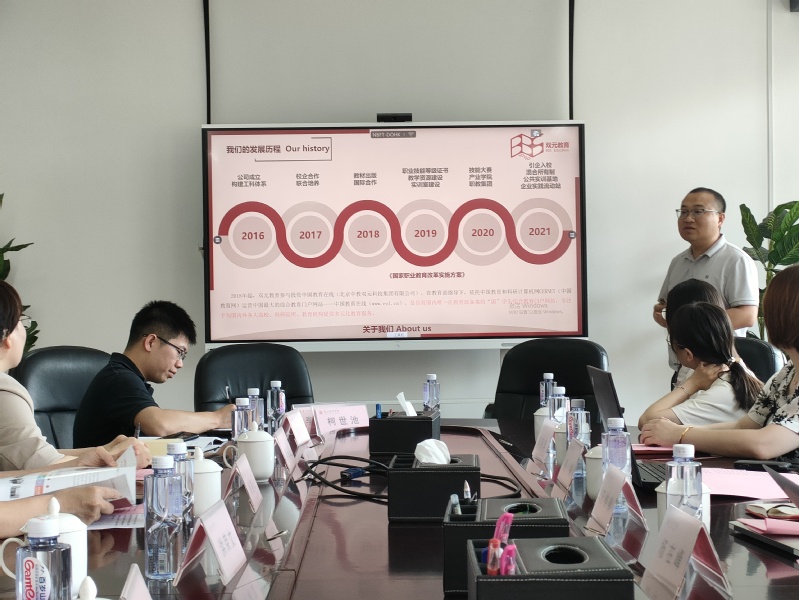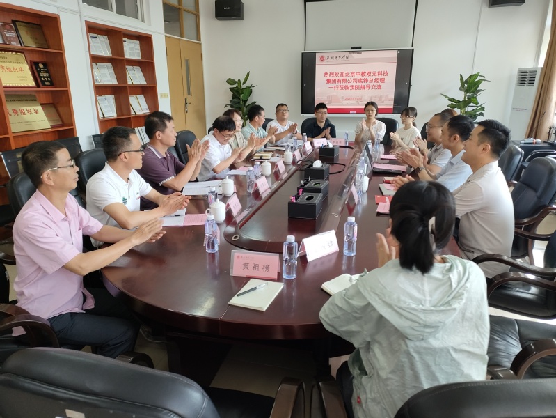 2023年6月13日上午,北京中教双元科技集团有限公司底铮总经理一行莅临我院开展交流指导工作,双方在理工208会议室举行座谈会。我院院长杨惠山、院党委书记吴丽双、院党委副书记洪荣文、副院长陈木生、各科室负责人、全体辅导员和学生代表参加。