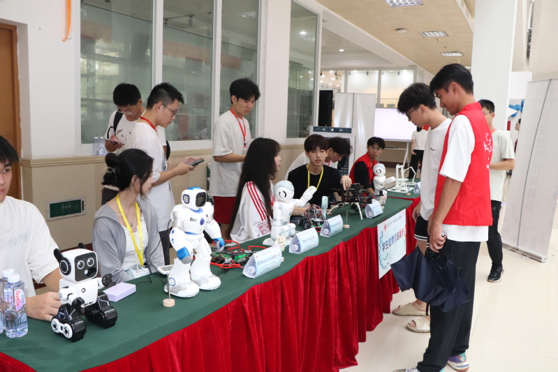 我院展示学生优秀获奖科技作品,设计者们详细讲解无人机、机器人、智能循迹小车和3D打印样品等作品的创作过程和设计理念。校长陈昌萍莅临现场指导,对展品给予高度评价,并对新生们寄予厚望,鼓励他们积极投身科技创新活动,激发他们对专业的兴趣和热爱。