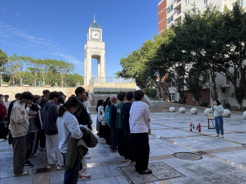 师生们安全撤离到中山广场后,保卫部洪国祥老师向大家介绍了消防器械的技术指标,并演示了如何正确使用消防器械扑灭火焰。现场师生认真观摩学习,并亲自体验灭火的过程:提起灭火器、拔掉保险销、握住软管顶部喷嘴、对准火源根部压下把手,迅速将火苗成功扑灭。