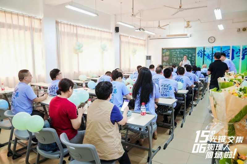 熟悉的教室见证了久别重逢的喜悦。校友们在签名墙上郑重留下姓名,笔尖流转间是对青葱岁月的深情回望;身着印有“06物理”字样的定制文化衫,仿佛瞬间唤醒了珍藏的同窗记忆。师生围坐畅谈,当年课堂上的热烈讨论、实验室里的专注身影、毕业季的依依惜别,都化作此刻的欢声笑语,在教室中流淌。