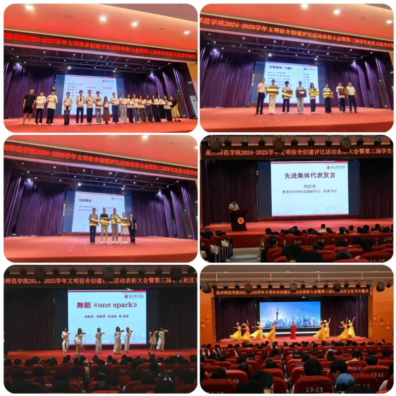 大会在庄严的宣读表彰文件中拉开帷幕。学工部、保卫处、校团委、后勤管理处等部门相关负责人分别为4个先进集体、6个文明楼栋、117间文明宿舍、302名先进个人及学生社区优秀员工颁奖。教科学院党委副书记刘宗安分享了学院在文明宿舍创建中的经验做法,传递“以小见大、共建共享”的建设理念;文学与传播学院李远方同学作为获奖代表分享了参与创建活动的心得体会。教科学院、音舞学院学生带来了精彩文艺表演,展现了青年学子昂扬向上的精神风貌和深厚的家国情怀。