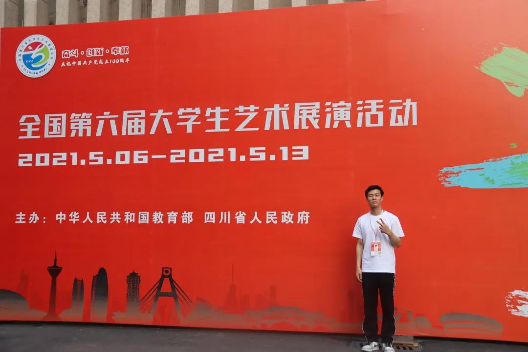 在学校的培养和恩师的教诲下,他的专业水平有了很大的提高,开始尝试接触更大的艺术空间和平台。2020年,他参与编创的舞蹈作品《悬丝指语》获福建省第六届大学生艺术展演舞蹈乙组(专业组)优秀创作奖和表演一等奖(第一名),并作为全省唯一一个专业组舞蹈作品入围全国第六届大学生艺术展演活动获艺术表演类乙组一等奖和优秀创作奖。此外,还成功立项福建省高校原创文化精品推广行动计划项目。2021年,他被学校推荐,代表泉州赴北京参加中央广播电视总台春节联欢晚会,在春晚的舞台上参与了5个节目的表演。整整52天的观摩实践和演出,他亲眼见证和参与了高水平的节目创作,为伟大祖国博大精深的文化底蕴感到骄傲,也更加坚定了其成为一名文化传承者的信心和决心。