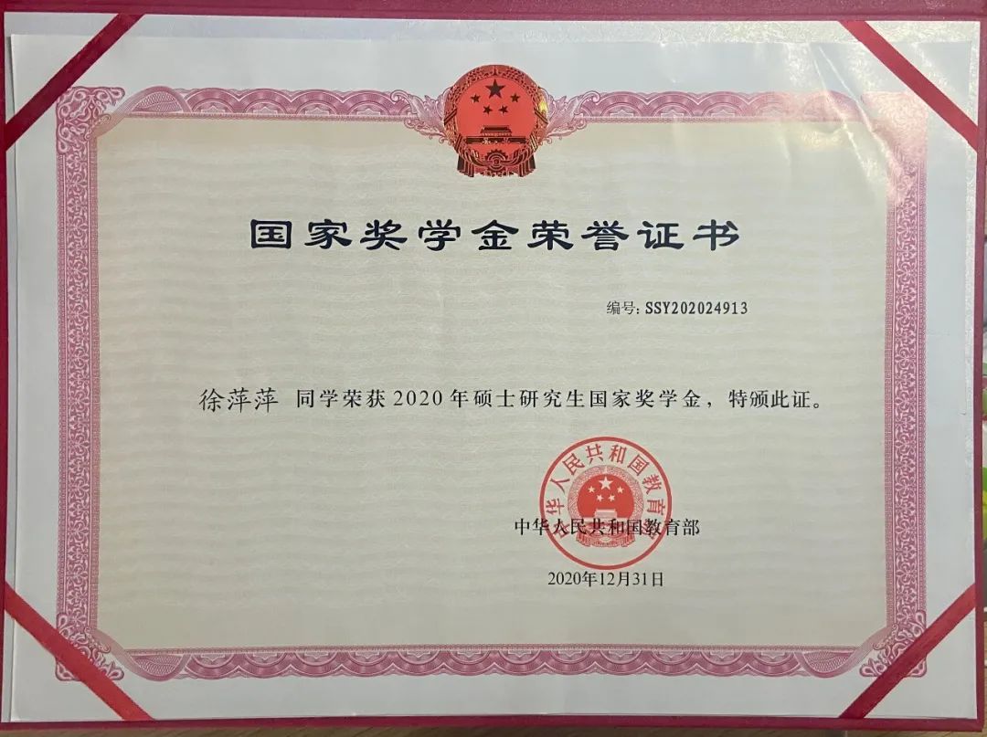 (3)2020年12月,获得硕士研究生“国家奖学金”。