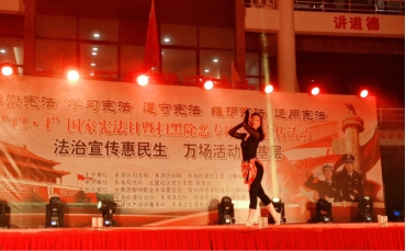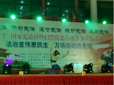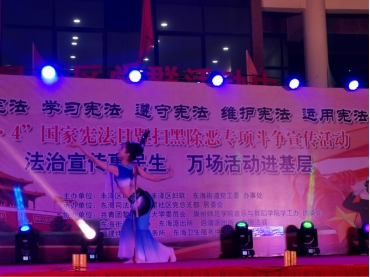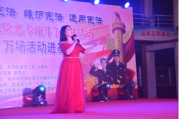 为提高全民法治观念,维护宪法权威,全面推进依法治国,12月3日晚,由丰泽区司法局、丰泽区妇联、东海街道党工委、东海街道办事处主办,东海司法所、北星社区党总支部居委会承办,英国威廉希尔公司官网音乐与舞蹈学院学工办、团委会、东海街道综治办等单位协办的以“尊崇宪法、学习宪法、遵守宪法、维护宪法、运用宪法”为主题的“12.4”国家宪法日暨扫黑除恶专项斗争宣传活动于海星小区广场成功开展。