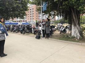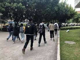 活动当天,按照演练预设,同学们刚下课,警报负责人发出“口哨”警报,各班班长立即组织班级学生迅速、有序地按计划的逃生路线撤离疏散,逃生到指定的安全区域(学院停车场)。团支书积极配合班长疏散同学,确认同学是否全部安全离开教室。
