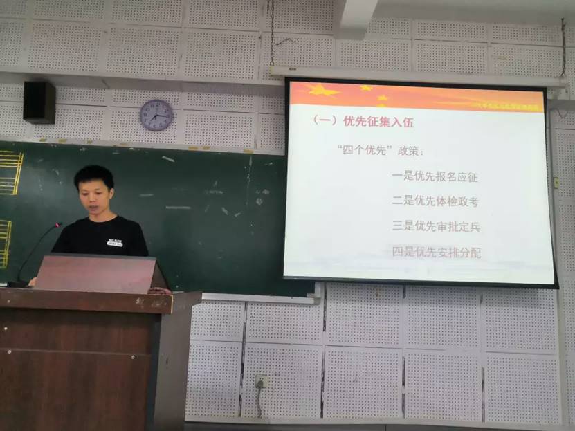 会上,戴志明同志播放了《参军报国,准备出发》等大学生应征入伍宣传短片,向同学们介绍了当前我国的征兵政策,并详细解读了大学生参军入伍所享有的优惠政策,包括保留学籍、国家学费资助、升学考试与研究生招生加分等,以及应征条件、应征流程、发展途径以及经济补助等热点问题。活动最后,戴志明同志热情鼓励同学们要积极应征入伍,为实现中国梦、强军梦做出贡献。
