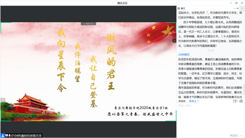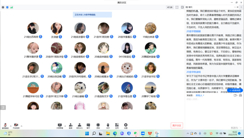 5月19日,学院学工办于线上组织学习习近平总书记考察中国人民大学重要讲话精神。会上,同学们分别观看了“习近平——争做担任民族复兴重任的时代新人”和“习近平——当代中国青年生逢盛世肩负重任”视频,并纷纷分享了观后心得。2021级音乐学(闽台)苏雨思表示,我们正处于一个伟大的时代,在新时代下中国青年应该与时俱进,自觉承担起新时代赋予我们的历史使命。