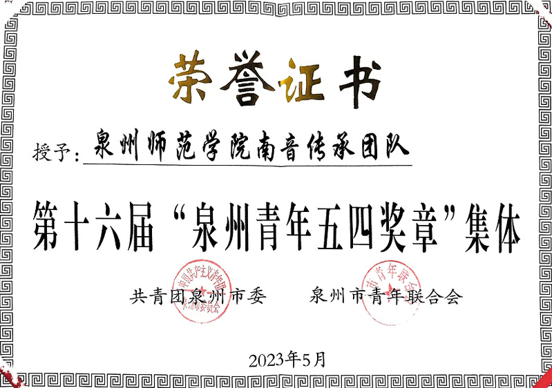 5月4日,泉州团市委举行纪念五四运动104周年暨中国共产主义青年团成立101周年主题活动,我院南音传承团队荣获第十六届“泉州青年五四奖章”集体。