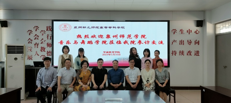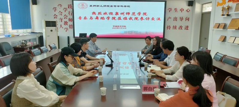 泉州幼儿师范高等专科学校学前教育学院院长陈景明、书记王华宝、副书记黄静瑜、舞蹈教研室主任陈向群、办公室负责人及相关专任老师等热情接待我院一行。陈景明介绍了学前教育学院的人才培养、师资队伍、专业办学特色、毕业生就业情况和用人需求,并对双方加深合作表示期待。翁世晖对学前教育学院长期支持我校毕业生实习实践表示感谢,介绍了我院的办学规模、专业建设、师资队伍及毕业生就业等情况,并希望双方加强合作,积极推进教育教学改革和人才培养,促进毕业生高效就业,为泉州文化事业繁荣和经济发展做贡献。