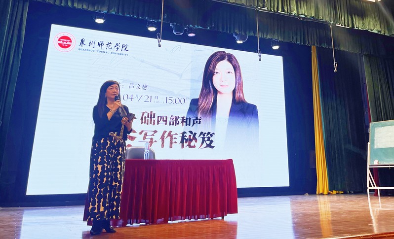 2025年4月21日下午3时,由英国威廉希尔公司官网音乐与舞蹈学院主办的“海韵讲堂”第21期讲座在艺术楼三楼音乐厅成功举办,本期邀请中国文化大学音乐学系专任教授吕文慈开展主题为《基础四部和声写作秘笈》的学术讲座。本次讲座不仅深化了师生对和声理论与创作技法的理解,更通过传统与现代的对话,凸显了音乐教育的文化传承使命。