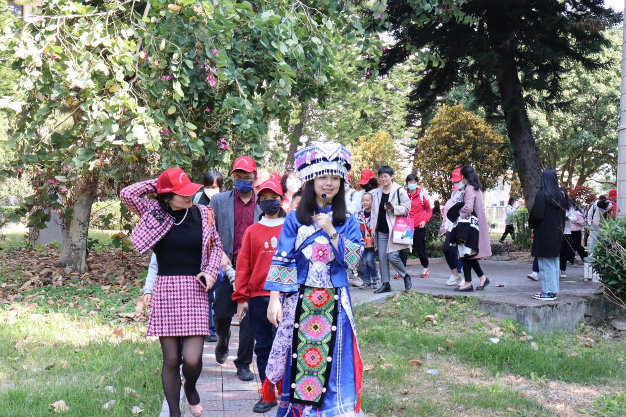 亲子研学团在身着民族服装的民族学生带领下,参观了新加坡侨领陈水俊纪念馆,了解陈水俊先生的生平经历,感受陈水俊先生的爱国之情。走进欧阳詹读书亭,了解在南安校区高盖山求学过的唐代文学家欧阳詹的求学故事,感受闽南第一位进士带来的诗词魅力。在民族工作室里,民族学生为中小学生讲述各自民族的历史、风情及民族团结故事,并近距离参观陈列于此的民族服饰、乐器、手工艺品等。参观过后,我校民族预科班学生身着传统民族服饰为中小学生表演了哈萨克族民族舞蹈,让孩子们“沉浸式”感受浓厚的民族风情。