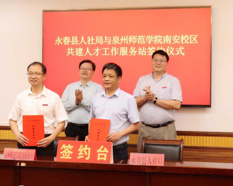 随后,南安校区党工委书记洪少春与张国强代表双方就共建人才工作服务站签订协议并举行授牌仪式。学校还与泉州怡辰科技有限公司举行了共建大学生实践基地签约暨授牌仪式。