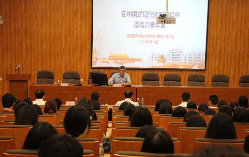 6月8日下午,副校长黄江昆在南安校区黄仲咸学术报告厅以《在中国式现代化新征程中谱写青春华章》为题,为南安学院师生讲授主题教育专题党课,南安学院党政负责人、全体师生党员、入党积极分子等参加学习。