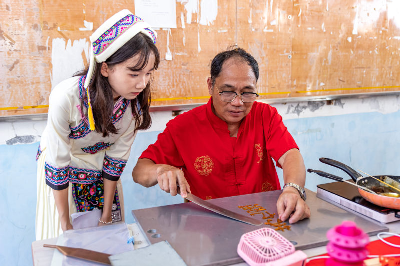 陈学珍师傅正在展示糖画的制作过程