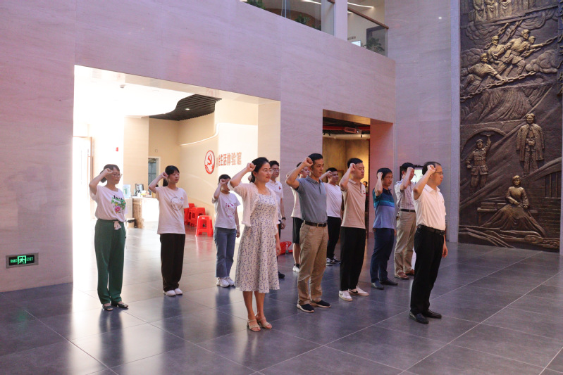 在馆内宣誓区,在两侧大型壁雕衬托下,由南安学院党委书记洪少春领誓,全体党员昂首而立,面向党旗庄严举起右手,高声宣读入党誓词,坚定洪亮的宣誓声响彻展馆。
