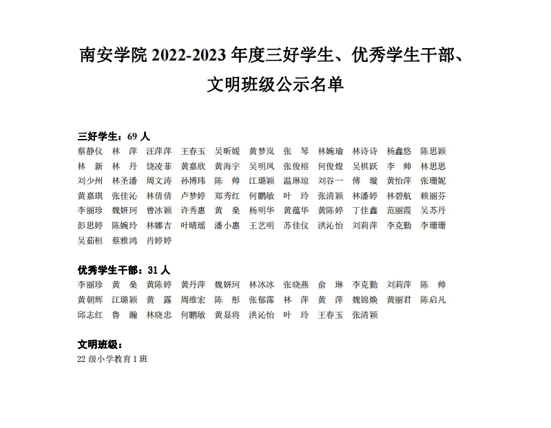 南安学院2022-2023学年三好学生、优秀学生干部、文明班级公示