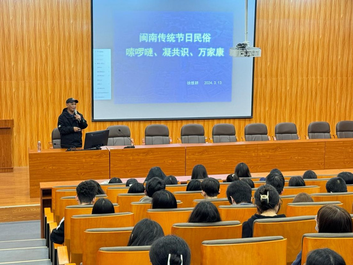 中国摄影家协会会员、晋江市摄影家协会名誉主席、晋江市新闻摄影学会名誉会长徐维耕立足于弘扬传统文化、铸牢中华民族共同体意识,给民族预科班和专升本的同学们带来了以国家非遗代表性项目“嗦啰嗹”为主,融合多项闽南传统民俗活动的文化知识讲座。