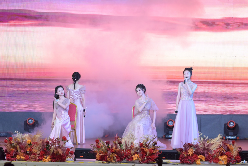 黄妍组合在《一路生花》的演出中,以明快的节奏和欢快的旋律展现了青春的美好与活力。四位成员身着优雅的粉色礼服,在舞台上与背景的夕阳和海洋完美融合,营造出浪漫而梦幻的氛围。她们的表现充满了自信和感染力,让观众们陶醉其中。