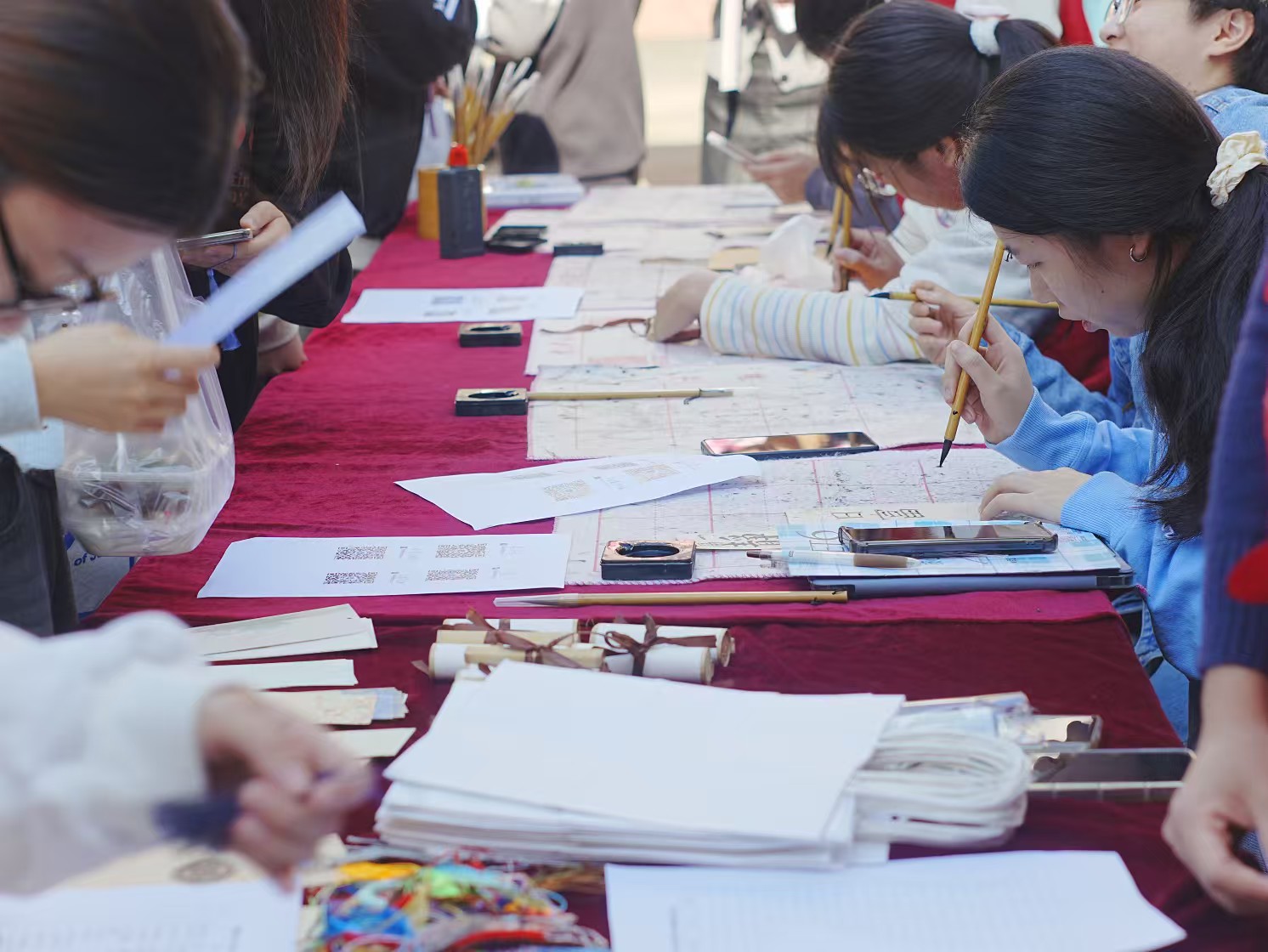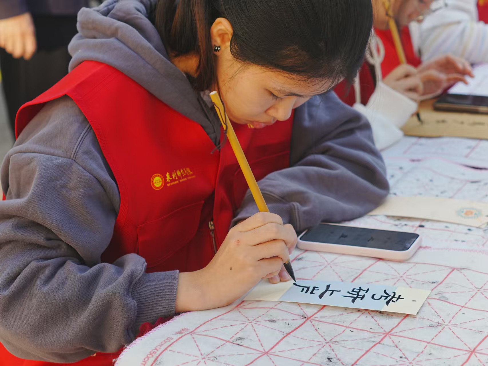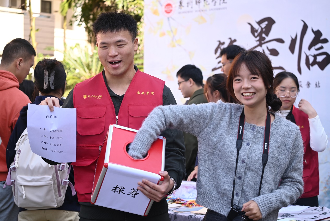 在“笔墨临古”书法体验环节中,不少同学聚集于抽奖箱前“探筹抓阄”,获得了自己的祈福书签,或亲自上前挥毫泼墨,体会汉字的力与美。软笔凝聚浓厚墨汁,缓慢渗透于纸上,在熟练有力的运笔之下呈现出饱含真情的祝愿,希望能够在考场中一举夺胜、金榜题名,不负日夜磨炼的光阴。