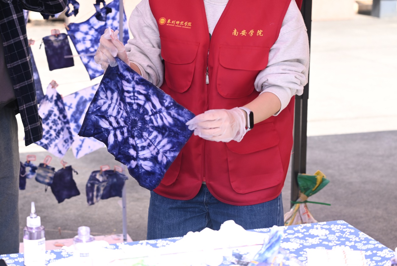 非遗扎染体验环节中,同学们通过纱、线、绳等工具,对织物进行扎、缝、缚、缀、夹等多种形式组合后染色,创造出独一无二的艺术作品,呈现出中华优秀传统文化的瑰丽之姿,这两种传统艺术的结合,不仅让学生亲身体验了中华优秀传统文化的魅力,也在实践中增强了对非遗文化的理解与传承意识。