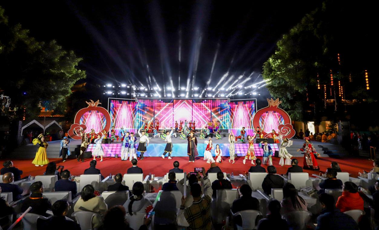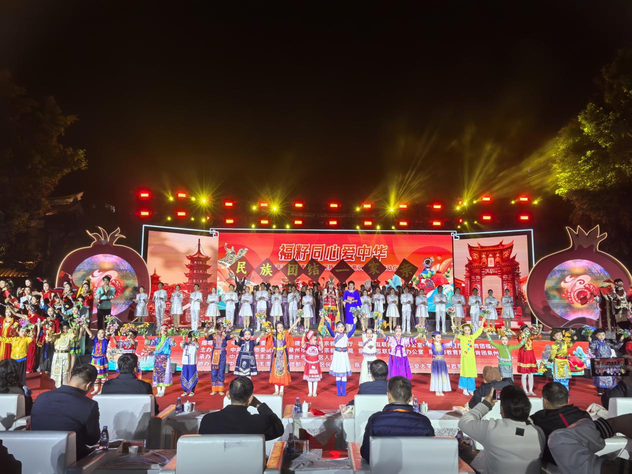 文艺演出中,来自民族预科班的维吾尔族、蒙古族、彝族等民族学生身着民族盛装,舞姿蹁跹,生动展现了中华民族大家庭的和谐画卷,传递了“福籽同心爱中华”的深刻主题。