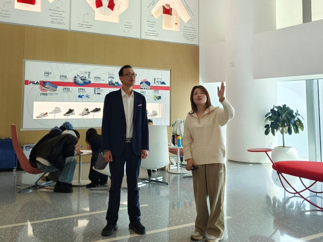 活动伊始,熊晨霏带领学院团队参观斐乐大厦,从智能化办公环境到员工健身房、休闲咖啡吧、特色食堂等生活配套,全方位展示了企业对员工的人文关怀与职业发展支持体系。座谈会上,潘莹系统介绍了安踏集团及斐乐品牌的战略布局与“斐凡生”人才培养计划,高度肯定南安学院毕业生的专业素养与实践能力,并提出“终面直通卡”、“定制化实习项目”等校企合作方向,期待深化实习基地建设与人才定向输送。