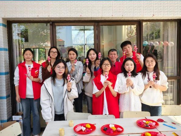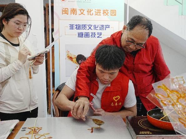 糖画摊位前,金黄的麦芽糖浆勾勒出蝴蝶、福字等寓意吉祥的图案,吸引了众多学生驻足观看。在陈学珍老师的耐心指导下,学生们亲手执勺,将温热的糖浆缓缓倾倒在石板上,绘制出属于自己的糖画作品。