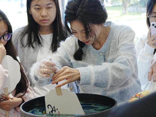 在漆扇制作体验区,刘璟耀老师指导学生们将素白的扇面浸入流动的漆彩中,随着手腕的轻轻转动,漆液在扇面上自然流淌,形成独一无二的斑斓纹样。每一把漆扇都因力度、角度和漆彩浓度的不同而呈现出独特的艺术效果,学生们在动手实践中感受传统工艺的魅力,也体会到了非遗技艺的精妙与创造力。