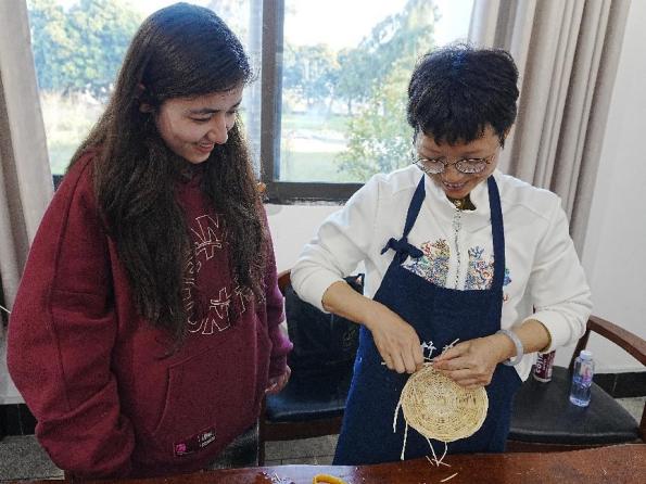在安溪竹藤编展位上,匠人手法娴熟,细长的竹篾仿佛拥有了生命,在他们的指尖灵活翻飞中,迅速编织成一个个精巧的竹筒、竹篮与竹垫,展现出竹编艺术的无穷魅力。学生们在陈红萍老师的悉心指导下体验到了传统工艺带来的成就感与乐趣。