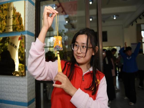珠绣香囊非遗传承人陈克忍老师现场示范珠绣技法,指导学生们在香囊缎面上缀饰亮片与琉璃米珠。珠绣香囊不仅成为了承载深厚文化记忆的非遗艺术品,更寄托了学生们的美好愿望,为这一传统技艺赋予了新的时代意义。