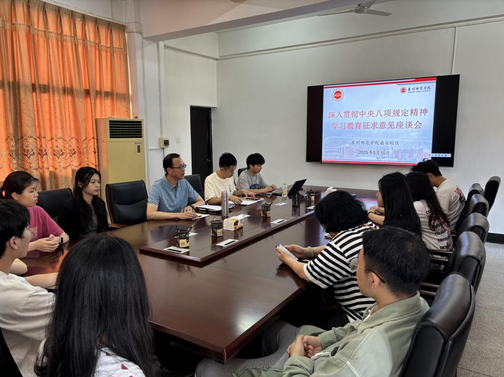 5月15日,南安学院召开深入贯彻中央八项规定精神学习教育征求意见座谈会。会议由学院党委副书记(主持工作)肖文清主持,学院各部门教职工代表、各班级学生代表参加。