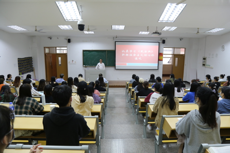 屈广清以《认真学习民法典,弘扬社会主义核心价值观》为题,从《中华人民共和国民法典》的重要意义、编纂历程、主要内容和新增规定等四个方面,为资环学院学生上了一堂通俗易懂的思政课。他指出,《中华人民共和国民法典》是凝聚中国人智慧的伟大法典,被誉为“社会生活的百科全书”,要深刻理解《中华人民共和国民法典》对推进全面依法治国、加快建设社会主义法治国家,弘扬社会主义核心价值观,推进国家治理体系和治理能力现代化的重大意义。他要求,同学们要结合专业特点学习《中华人民共和国民法典》,如将《中华人民共和国民法典》中的绿色原则充分运用到专业理论知识学习与毕业论文撰写中。