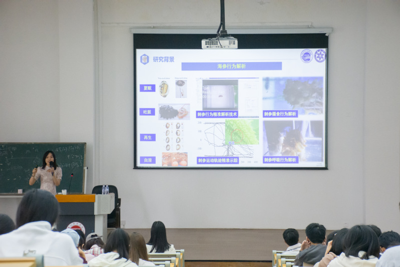 讲座上,邢丽丽副研究员用通俗易懂的语言、精彩有趣的案例介绍了动物体色是如何吸引了包括生物物理学、遗传学、发育生物学、进化生物学和生态学在内的各个学科的关注。同时也指出棘皮动物体色多样,进化地位特殊,在海洋物质能量循环中发挥重要的生态功能,为开展动物体色研究提供了良好材料。她们团队选择以不同体色的海参(例如白海参、紫海参等)为研究对象、利用单细胞测序、ATAC-seq、基因编辑等技术,结合一系列生态学实验,从外部环境适应、内部分子调控等层面系统揭示棘皮动物体色分化调控机制。讲座内容十分精彩,吸引了在座师生的极大兴趣及热情,氛围热烈。讲座结束后,师生互动活跃。