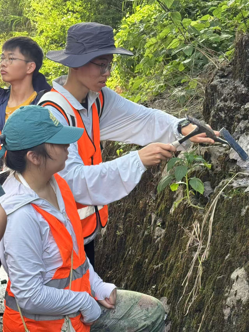 野外实习阶段,师生以小组为单位,沿五大路线展开精准观测。从魏坊至道班一线,同学们重点观察奥陶—志留系罗峰溪群至泥盆系南靖群等地层的岩性与构造,亲手采集岩石与化石标本,并在采石场实测石炭系下统林地组的褶皱与断层产状;在坑边—益口铁道沿线,大家围绕上侏罗统南园组各段地层,细致开展岩性描述与产状测量,为区域地质演化研究积累了宝贵的一手资料;大湖石林景区内,地表喀斯特形态与地下溶洞系统让大家深刻体会到大自然的鬼斧神工,也理解了喀斯特作用的垂直分带规律;桃源洞景区则成为认识丹霞地貌的生动课堂,同学们在上白垩统赤石群地层中探究“顶平、坡陡”形态背后的岩石胶结特性与构造控制机制。