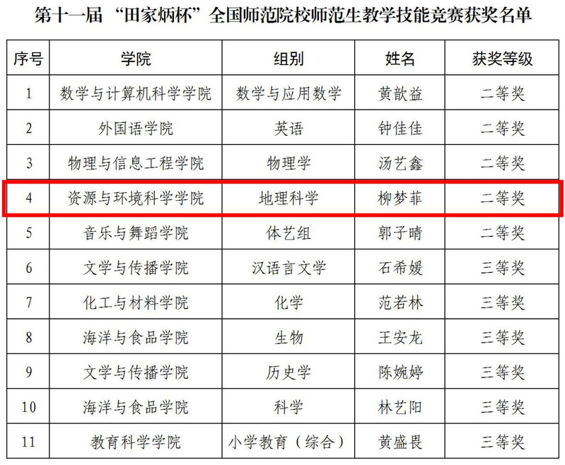 近日,第十一届“田家炳杯”全国师范院校师范生教学技能竞赛落下帷幕,我院2022级地理科学(师范类)专业学生柳梦菲(指导教师:杨诗源)荣获地理科学组二等奖。