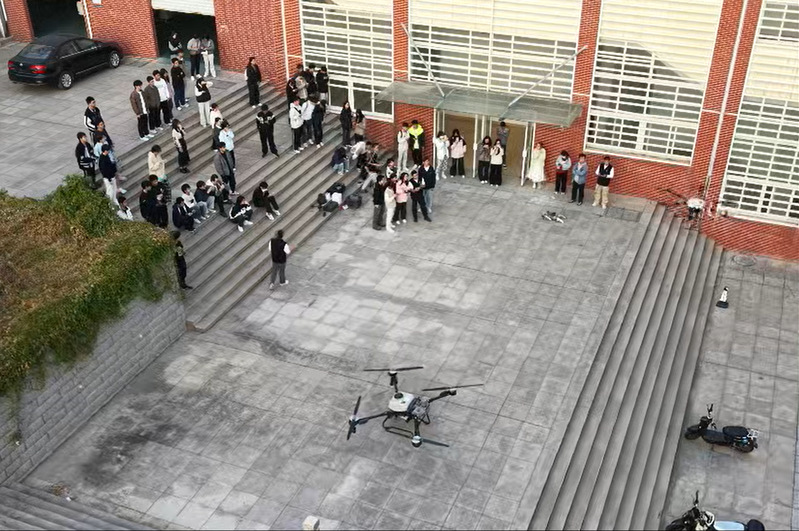 理论讲解结束后,讲座设置了户外实地实机体验环节。师生移步至室外开阔场地,在专业飞手指导下进行实操演练。同学们轮流操作无人机,练习起飞、悬停与航拍等基本指令,并就操控技巧与设备参数与飞手进行交流。
