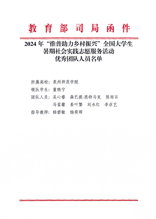 在2024年“推普助力乡村振兴”全国大学生暑期社会实践志愿服务活动中,我校教育科学学院推普志愿服务队(队员:董晓宁、吴心睿、森巴提·恩特马克、陈雨石、马蓝馨、姜叶繁、刘永红、李召艺,指导老师:杨碧敏、杨奕晖)从全国1200支实践团队中脱颖而出,被评为全国大学生暑期社会实践志愿服务活动“优秀团队”。