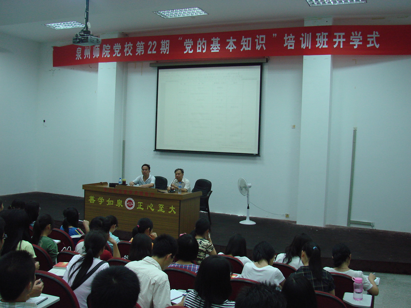 泉州师院党校第22期“党的基本知识”培训班开学式于5月26日晚上在孙中山纪念堂第3学术报告厅(党校教室)举行。校党委副书记、纪委书记、党校校长赖新民出席了开学式并作动员报告。会议由校党委组织部部长陈亚兵主持。 赖副书记在报告中从为什么要入党、具备什么条件才能入党、入党后如何发挥党员的先锋模范作用等三个方面阐释了举办培训班的目的及意义,并对全体学员提出了五点具体要求:一要端正学习态度,明确学习目的,扎实掌握党的基本理论、基本知识。二要以科学发展观为指导,认真学习马列主义、毛泽东思想及中国特色社会主义理论。三要遵守党校规章制度,正确处理好党校学习与工作、专业学习的关系。四要理论联系实际,勤于思考,把学习与地区发展、学校发展结合起来,用马列主义观点分析问题、解决问题。五要以本次学习为契机,加强党性锻炼,端正入党动机,树立正确的世界观、人生观、价值观,加深对党的感情,积极创造条件争取早日加入党组织。 参加本期培训班学员共有三百八十多名,培训班将采取集中辅导讲座、观看录象、自学、小组讨论、撰写心得体会和考试相结合的方式进行。 | |