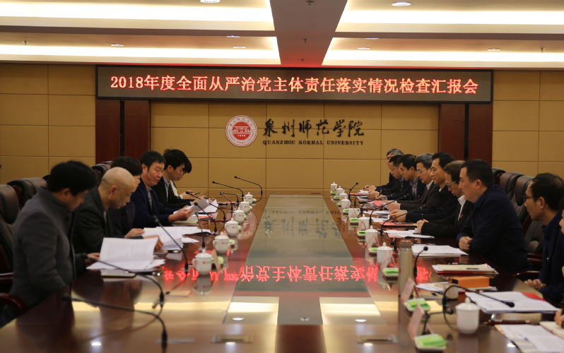 2月27日上午,受省委、泉州市委委托,泉州市纪委驻市教育局纪检组长陈进兴、市纪委驻市教育局纪检副处级纪检监察员林金莲等一行6人,莅临我校检查2018年度落实全面从严治党主体责任情况。校领导朱世泽、屈广清、高云程、林伟,校党务部门负责人以及各二级党委(党总支)负责人参加了汇报会。